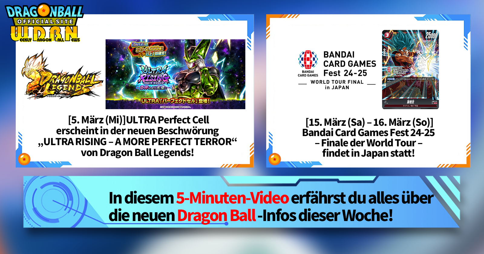 „Weekly Dragon Ball News“ ist eine Videoserie, die jeden Montag (JST) aktualisiert wird, um Ihnen die aktuellsten Nachrichten aus der Welt von Dragon Ball zu präsentieren! Begleiten Sie V Jump -Redakteur Victory Uchida, wenn er über die heißesten Neuigkeiten der letzten Woche berichtet und aktuelle Updates wie neue Produktinformationen und Site-Neuigkeiten für die kommende Woche präsentiert!