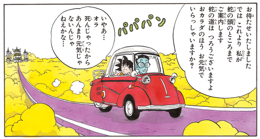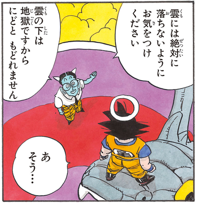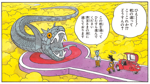 Als Experte für alles rund Another World erklärt dieser Führer Goku nicht nur, dass die Serpent Road etwa eine Million Kilometer lang ist, sondern er gibt dem Saiyan auch den Rat: „Pass auf, dass du nicht in die Wolken fällst. Dort unten ist die Hölle und du kommst nie wieder raus.“
