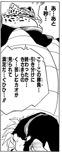 Makino: Ja! Ich möchte meinen Lieblingssatz aus Cell zitieren! „Hah, hah, hah, hah! Noch zehn Sekunden, und die Erde ist Geschichte! ... Ich schätze, wir beenden das Spiel mit einem Unentschieden!“