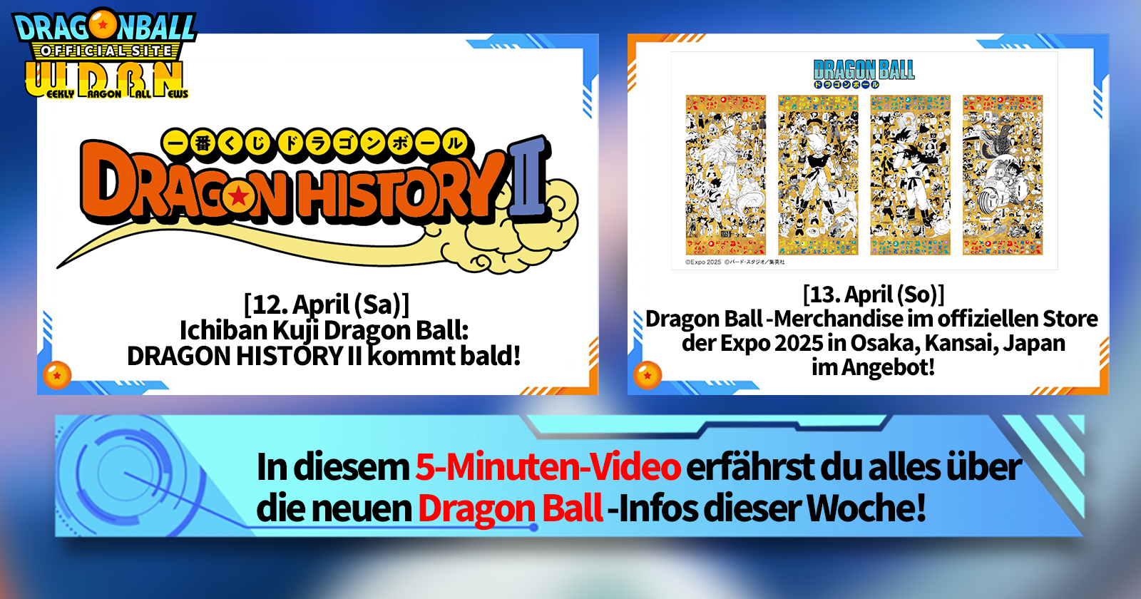 „Weekly Dragon Ball News“ ist eine Videoserie, die jeden Montag (JST) aktualisiert wird und Ihnen die aktuellsten Neuigkeiten aus der Welt von Dragon Ball bietet! Begleiten Sie V Jump -Redakteur Victory Uchida, der über die heißesten Neuigkeiten der vergangenen Woche berichtet und aktuelle Updates wie Produktinformationen und Site-Neuigkeiten für die kommende Woche präsentiert!