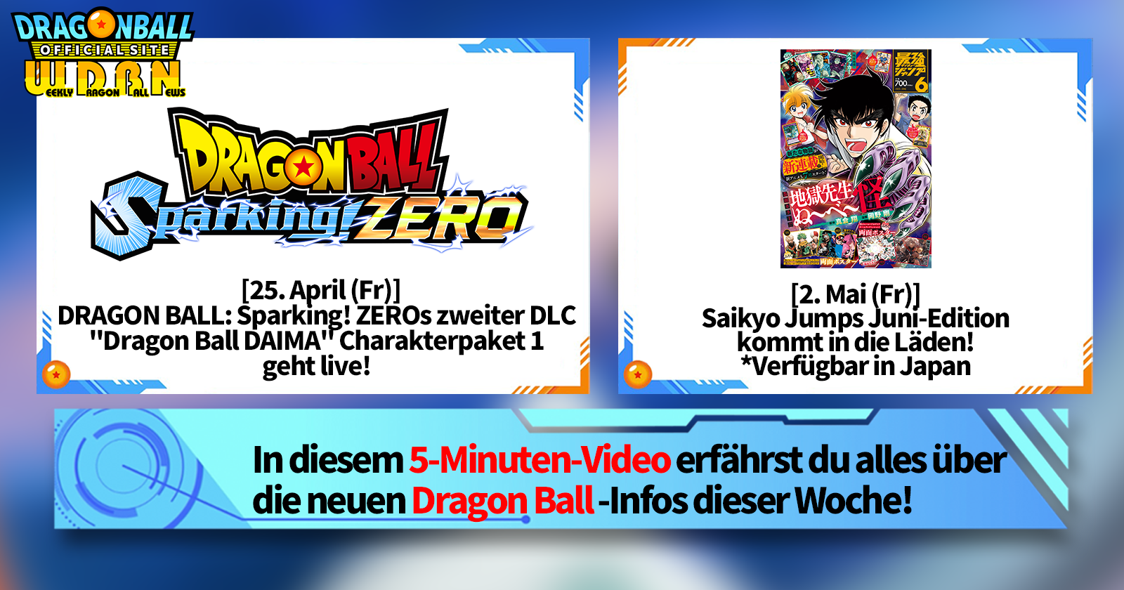 „Weekly Dragon Ball News“ ist eine Videoserie, die jeden Montag (JST) aktualisiert wird und Ihnen die aktuellsten Neuigkeiten aus der Welt von Dragon Ball bietet! Begleiten Sie V Jump -Redakteur Victory Uchida, der über die heißesten Neuigkeiten der vergangenen Woche berichtet und aktuelle Updates wie Produktinformationen und Site-Neuigkeiten für die kommende Woche präsentiert!