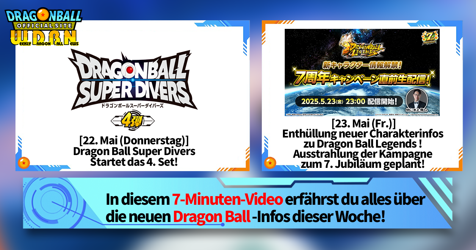 „Weekly Dragon Ball News“ ist eine Videoserie, die jeden Montag (JST) aktualisiert wird und Ihnen die aktuellsten Neuigkeiten aus der Welt von Dragon Ball bietet! Begleiten Sie V Jump -Redakteur Victory Uchida, der über die heißesten Neuigkeiten der vergangenen Woche berichtet und aktuelle Updates wie Produktinformationen und Site-Neuigkeiten für die kommende Woche präsentiert!