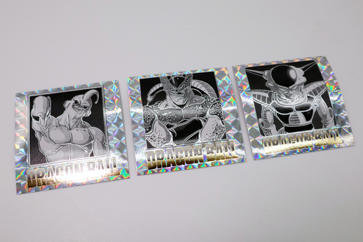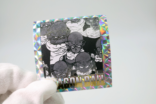 Die Abstufungen im Dragon Ball -Logo und die Ränder bestehen beide aus Goldfolie. Zusammen mit der in der Illustration verwendeten Silberfolie ergibt dies einen doppelten Folieneffekt.