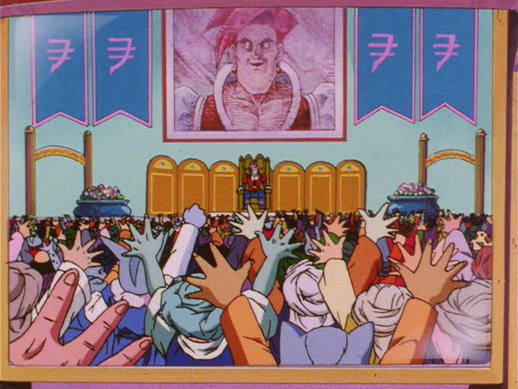 Während Goku und Redgic kämpfen, kann Don Kia nur von der Seitenlinie aus zusehen und die Zerstörung seines Palastes beklagen.