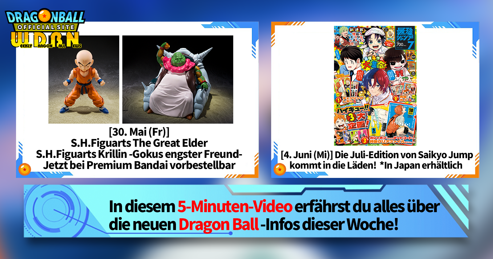 „Weekly Dragon Ball News“ ist eine Videoserie, die jeden Montag (JST) aktualisiert wird und Ihnen die aktuellsten Neuigkeiten aus der Welt von Dragon Ball bietet! Begleiten Sie V Jump -Redakteur Victory Uchida, der über die heißesten Neuigkeiten der vergangenen Woche berichtet und aktuelle Updates wie Produktinformationen und Site-Neuigkeiten für die kommende Woche präsentiert!