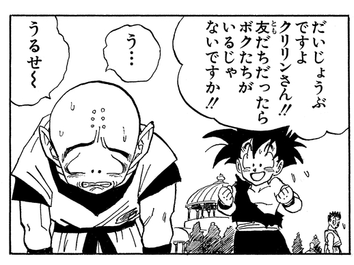 Krillin bietet seinen Verbündeten, die im Kampf gegen die Androiden verwundet wurden, Senzubohnen an. Als er Piccolo davonfliegen sieht, vermutet Krillin richtigerweise, dass dieser losgezogen ist, um mit Kami zu verschmelzen.