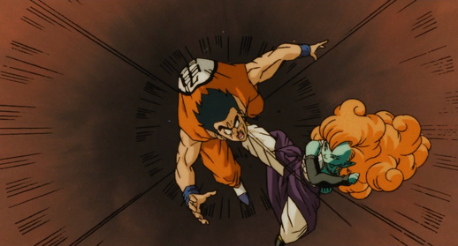 Sie erscheint plötzlich vor Krillin und schlägt den Krieger mit einer Reihe schneller Angriffe nieder.
