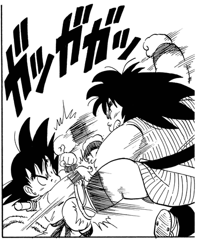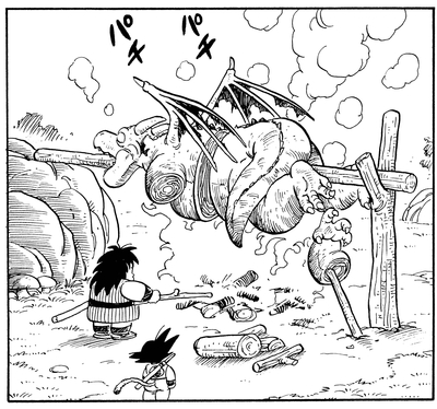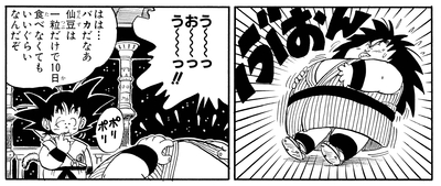 Nachdem er erfuhr, dass das Festessen, das Goku ihm versprach, nur ein paar mager aussehende Senzubohnen waren, verschlang er sie gierig alle und konnte sich als Ergebnis nicht bewegen!