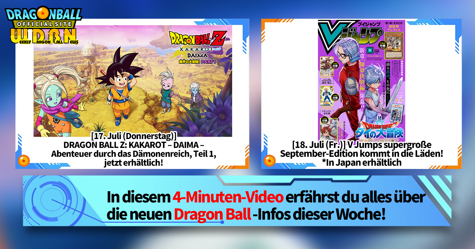 „Weekly Dragon Ball News“ ist eine Videoserie, die jeden Montag (JST) aktualisiert wird und Ihnen die aktuellsten Neuigkeiten aus der Welt von Dragon Ball bietet! Begleiten Sie V Jump -Redakteur Victory Uchida, der über die heißesten Neuigkeiten der vergangenen Woche berichtet und aktuelle Updates wie Produktinformationen und Site-Neuigkeiten für die kommende Woche präsentiert!