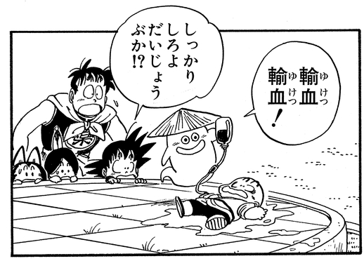 Der Geist Usher gibt Krillin eine Bluttransfusion, nachdem ihm der Krieger der Fortuneteller Baba, Draculaman, das Blut ausgesaugt hat.