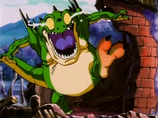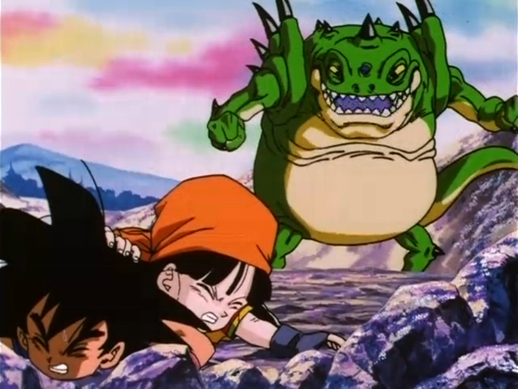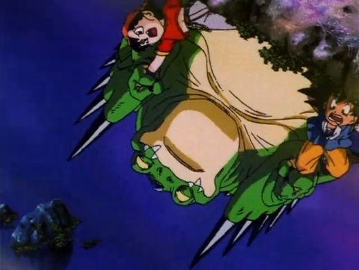 Liang-Shinron verwendet dann seine Spezialtechnik, um Goku und Pan zurückzustoßen, bevor er sie in den nun giftigen See fallen lässt.