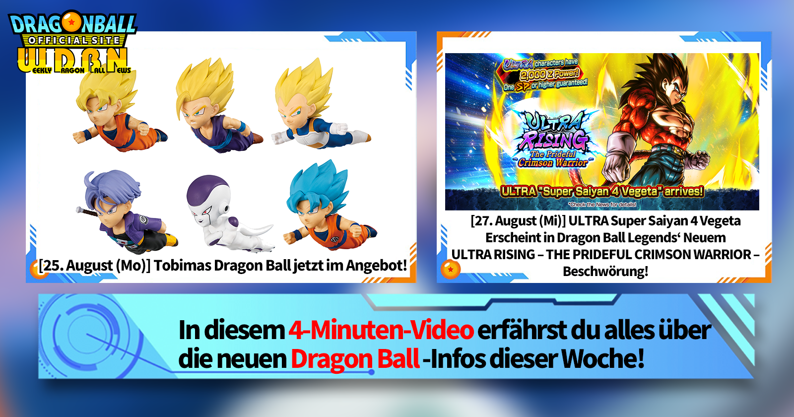 „Weekly Dragon Ball News“ ist eine Videoserie, die jeden Montag (JST) aktualisiert wird, um Ihnen die aktuellsten Neuigkeiten aus der Welt von Dragon Ball zu präsentieren! Begleiten Sie V Jump -Redakteur Victory Uchida, der über die heißesten Neuigkeiten der vergangenen Woche berichtet und aktuelle Updates wie Produktinformationen und Site-Neuigkeiten für die kommende Woche präsentiert!