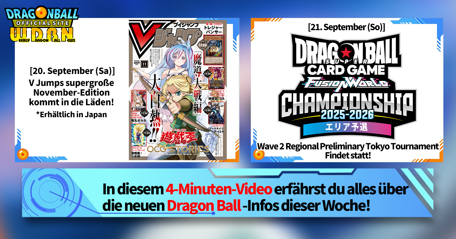 „Weekly Dragon Ball News“ ist eine Videoserie, die jeden Montag (JST) aktualisiert wird, um Ihnen die aktuellsten Neuigkeiten aus der Welt von Dragon Ball zu präsentieren! Begleiten Sie V Jump -Redakteur Victory Uchida, der über die heißesten Neuigkeiten der vergangenen Woche berichtet und aktuelle Updates wie Produktinformationen und Site-Neuigkeiten für die kommende Woche präsentiert!