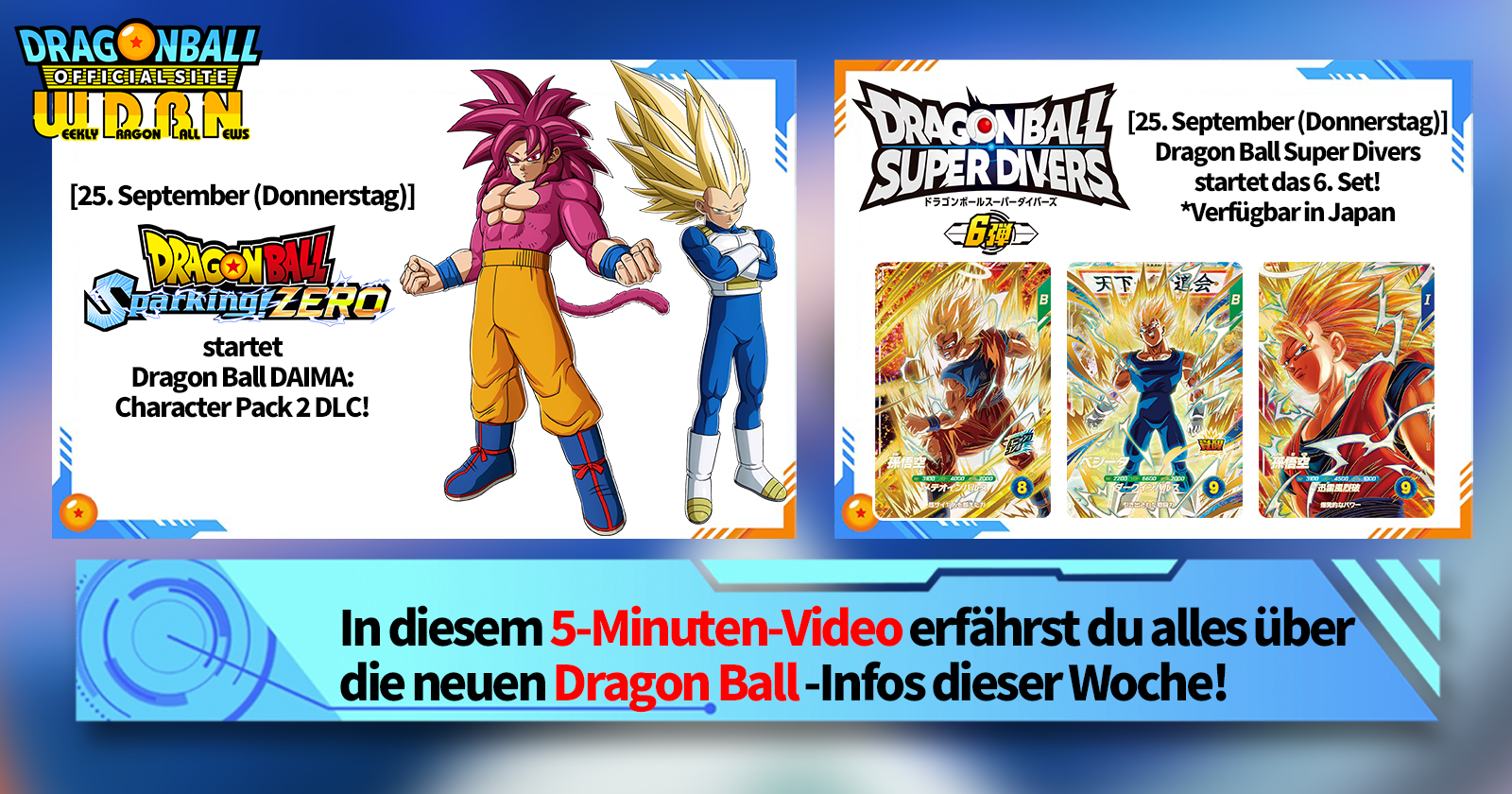 „Weekly Dragon Ball News“ ist eine Videoserie, die jeden Montag (JST) aktualisiert wird, um Ihnen die aktuellsten Neuigkeiten aus der Welt von Dragon Ball zu präsentieren! Begleiten Sie V Jump -Redakteur Victory Uchida, der über die heißesten Neuigkeiten der vergangenen Woche berichtet und aktuelle Updates wie Produktinformationen und Site-Neuigkeiten für die kommende Woche präsentiert!