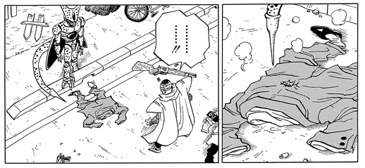 Gerade als es so aussieht, als sei er aus Cells Fängen befreit, ersticht der Bösewicht den Mann mit seinem Schwanz und absorbiert dabei seine gesamte Energie.