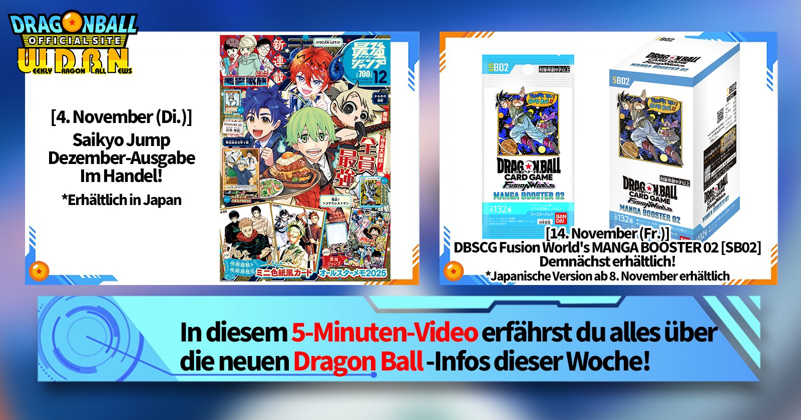 „Weekly Dragon Ball News“ ist eine Videoserie, die jeden Montag (JST) aktualisiert wird und euch die neuesten Nachrichten aus der Welt von Dragon Ball präsentiert! Begleitet V Jump -Redakteur Victory Uchida, der euch die heißesten Infos der Vorwoche sowie aktuelle Updates wie Produktneuheiten und Website-News für die kommende Woche vorstellt!