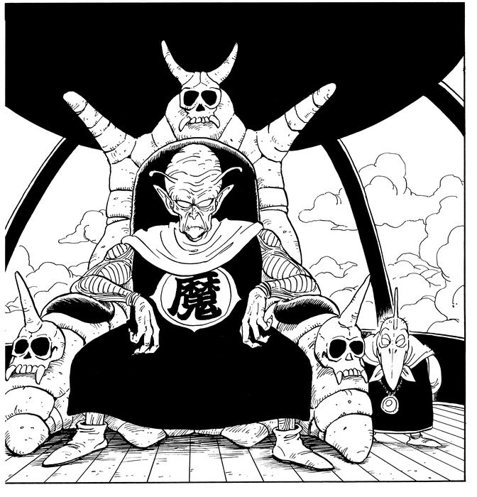 Mit einem Aussehen, das sich deutlich von allen zuvor aufgetauchten Charakteren unterscheidet, und seinem Thron, der mit Totenköpfen verziert ist, vermittelt diese Szene den Lesern wahrlich die furchterregende, imposante Aura eines großen Dämonenkönigs. Schließlich gelingt es ihm, Goku die Dragon Balls zu entreißen und seine Jugend wiederzuerlangen, woraufhin er die Weltherrschaft anstrebt.