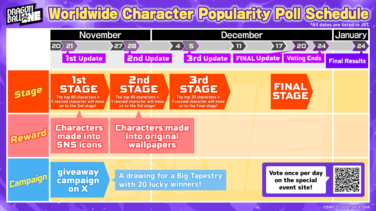 Die endgültige Rangliste soll in einer Sondersendung am 24. Januar 2026 um 12:00 Uhr (JST) bekannt gegeben werden.Offizieller Dragon Ball YouTube Kanal!