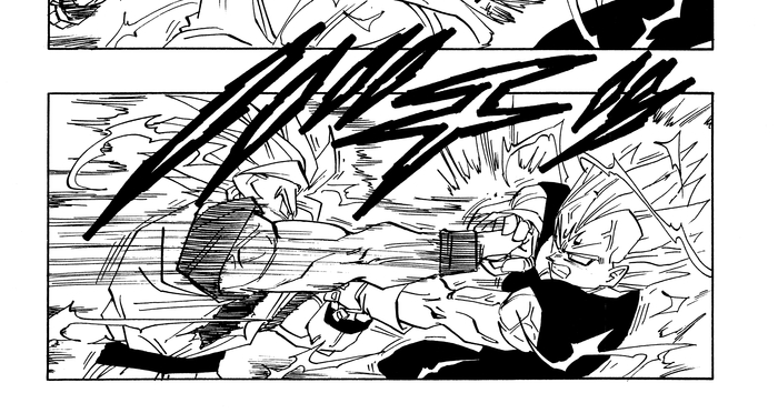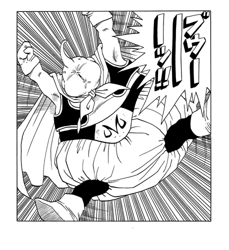 Vegeta kehrt aus einer Another World zurück und fusioniert mit Goku mithilfe der Potara-Ohrringe zum unglaublich starken Vegito. Dieser besiegt Super Buu vernichtend, dringt dann in Buus Körper ein und befreit die von Buu absorbierten Krieger. Daraufhin spaltet sich Majin Buu (Good) ab und nimmt wieder seine ursprüngliche, reine Form an. Im Supreme Kai's Realm entbrennt ein Kampf um das Schicksal des Universums zwischen Goku und Majin Buu (Pure) . Das folgende Bild zeigt den schicksalhaften Moment, in dem ihr Duell endet.
