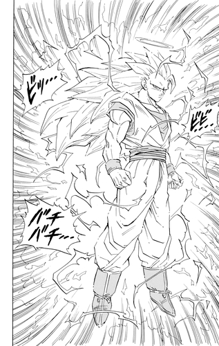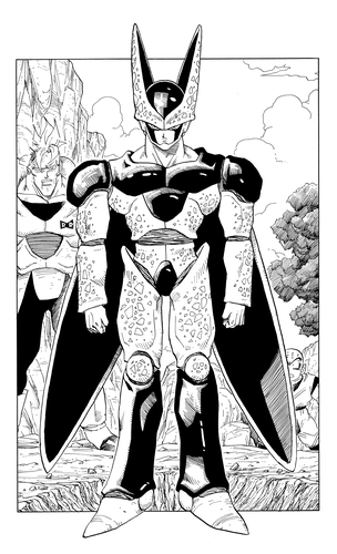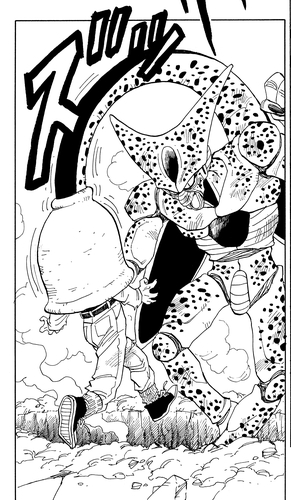 Nachdem Vegeta im Room of Spirit and Time trainiert hat, um die Androiden zu besiegen, überwältigt er Cell in Second Form mit seiner Stärke. Doch nachdem Cell ihn herausgefordert hat, gibt er seiner Neugierde nach und willigt ein, den Kampf vorerst zu unterbrechen. Trotz Trunks' verzweifelter Versuche einzugreifen, absorbiert Cell Android 18 und entwickelt sich zu seiner Perfect Form. Das untenstehende ganzseitige Panel zeigt Cells neue, imposante Gestalt.