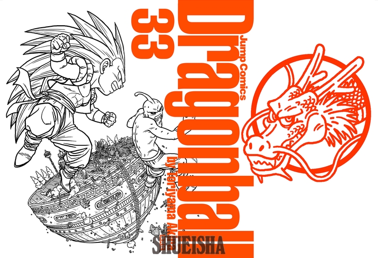 Hier sehen wir einen erbitterten Kampf zwischen Gotenks und Majin Buu über Kami's Palace. Die verheerende Zerstörung des Palastes zeugt von der Intensität ihres Kampfes, während die Linienzeichnung alle Details – vom Inneren des Palastes bis hin zu den verstreuten Trümmern – klarer erkennen lässt.