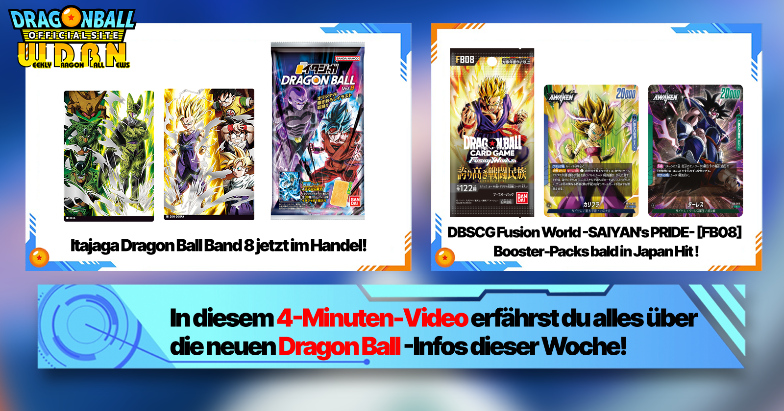 „Weekly Dragon Ball News“ ist eine Videoserie, die jeden Montag (JST) aktualisiert wird und euch die neuesten Nachrichten aus der Welt von Dragon Ball präsentiert! Begleitet V Jump -Redakteur Victory Uchida, der euch die heißesten Infos der Vorwoche sowie aktuelle Updates wie Produktneuheiten und Website-News für die kommende Woche vorstellt!