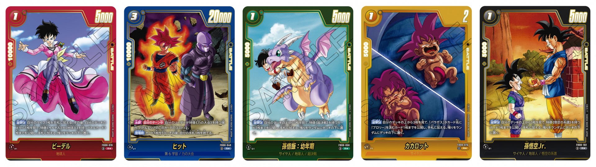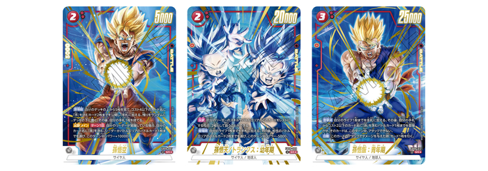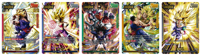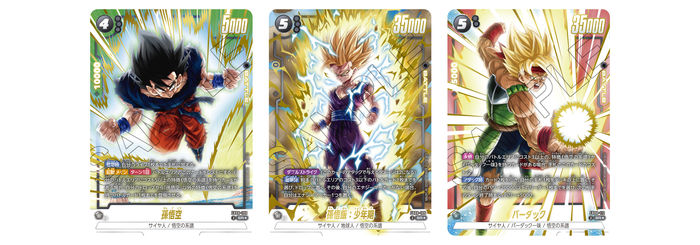 Die roten SR-Alternativkarten zeigen Krieger, die in den Filmen gegen Broly kämpften: „Son Goku“, „Son Goten/ Trunks: Jugend“ und „Son Gohan: Jugend“! „Son Goku“ und „Son Gohan: Jugend“ besitzen beide eine Fähigkeit, die beim Ausspielen aktiviert wird und Karten mit „Son“ im Namen beeinflusst. Nutze diese Fähigkeiten kombiniert und entfessele gewaltige Macht!