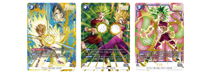 Die blauen SR-Alternativkarten sind „Cabba“, „Kale“ und „Kefla“, Krieger aus Universe 6 , die im Tournament of Power in Dragon Ball Super kämpften! „Kale“ besitzt eine fantastische Fähigkeit, mit der du bis zu eine Kampfkarte mit Kosten von 3 oder weniger und dem Spezialmerkmal „Tournament of Power“ aus deiner Hand spielen kannst. Du kannst diese Fähigkeit sogar nutzen, um „Cabba“ auszuspielen! Außerdem hat „Cabba“ eine mächtige Fähigkeit, mit der du bis zu eine Kampfkarte deines Gegners unter sein Deck legen kannst, wodurch du sofort die Oberhand gewinnst!