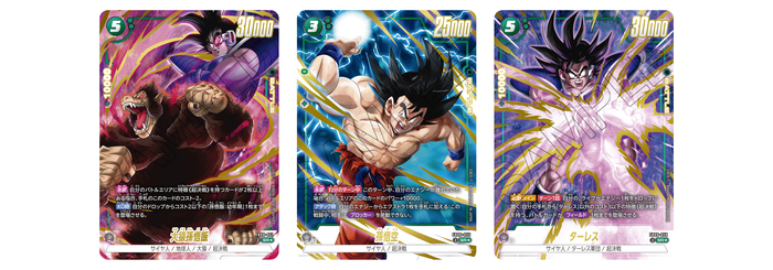 Die „grünen“ SR-Alt-Art-Karten zeigen Saiyan Krieger, die im Film Dragon Ball Z: Der Tree of Might erbittert gekämpft haben: „Great Ape Son Gohan“, „Son Goku“ und „Turles“.