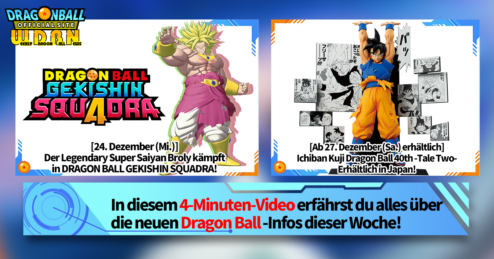 „Weekly Dragon Ball News“ ist eine Videoserie, die jeden Montag (JST) aktualisiert wird und euch die neuesten Nachrichten aus der Welt von Dragon Ball präsentiert! Begleitet V Jump -Redakteur Victory Uchida, der euch die heißesten Infos der Vorwoche sowie aktuelle Updates wie Produktneuheiten und Website-News für die kommende Woche vorstellt!