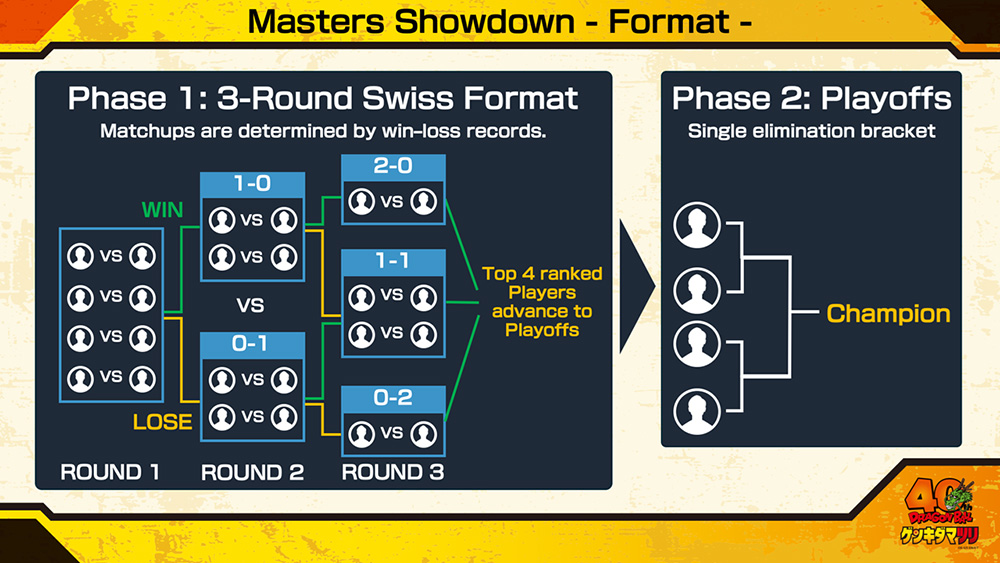 Es handelt sich um ein Turnier im Schweizer System, bei dem jeder Teilnehmer drei verschiedene Begegnungen bestreitet. Die vier Besten erreichen anschließend das Finale, in dem der Champion ermittelt wird! Diese Regeln gewährleisten, dass jeder Teilnehmer die Chance erhält, sein Können unter Beweis zu stellen, und garantieren uns einige spannende Duelle!
