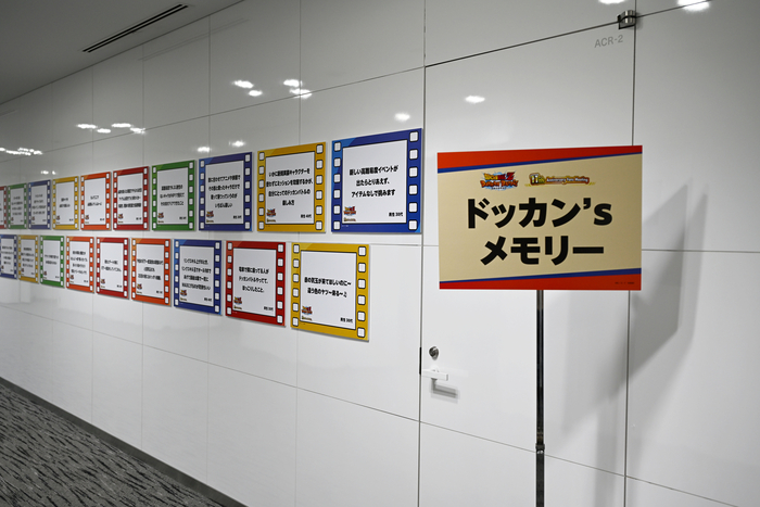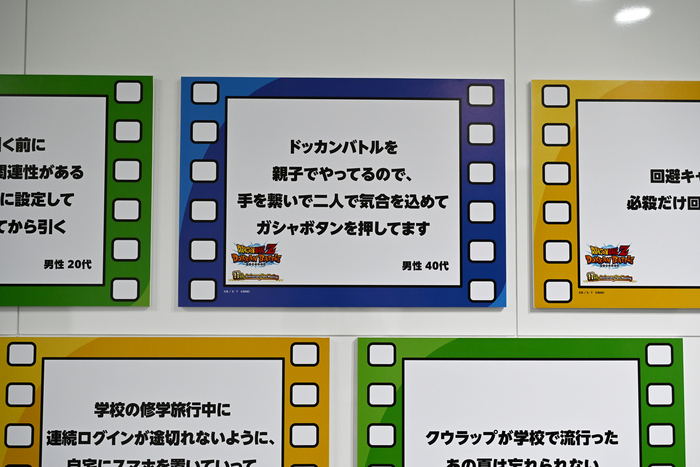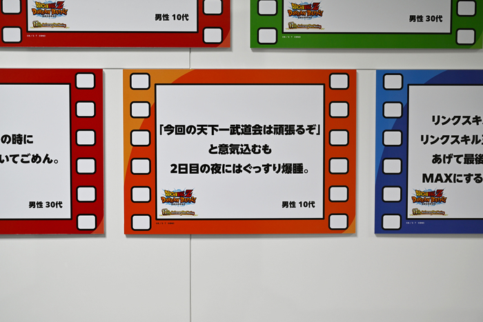 Hier gab es die DOKKAN-Erinnerungsausstellung, eine Zusammenstellung von Nutzerbeiträgen aus den sozialen Medien. Die Tafeln waren dem bekannten Support-Meldungsmenü im Spiel nachempfunden und gespickt mit Anekdoten, bei denen Dokkan-Fans instinktiv zustimmend nickten. Besucher, die stehen blieben, um die Ausstellung zu betrachten, mussten lächeln, weil sie sich so sehr mit den Geschichten identifizierten.