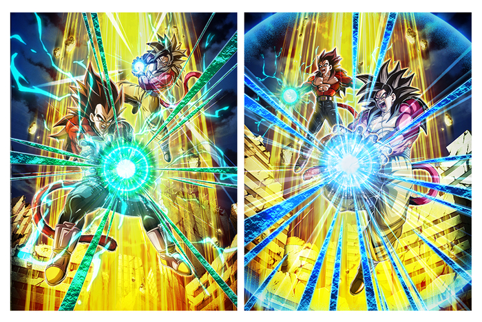Rechts: "[Finaler Showdown gegen die Schattendrachen] Super Saiyan 4 Goku + Super Saiyan 4 Vegeta"