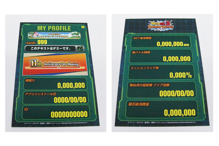 Dies sind die „Mein Profil“-Karten, die den Teilnehmern beim Einlass ausgehändigt wurden! Sie enthalten die Dokkan Battle Daten des Spielers, darunter Rang, Gesamtzahl der Kämpfe, Missionsabschlussrate und vieles mehr!