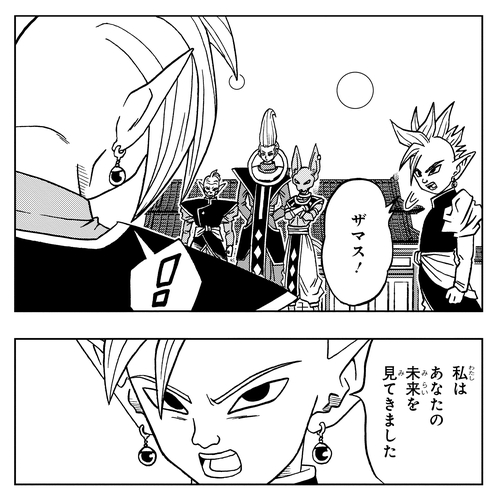 Anschließend erzählt er Beerus , dass Zamasu in der Zukunft mit Goku die Körper tauscht, um zu Goku Black zu werden, und sich mit dem zukünftigen Zamasu verbündet, um The Zero Mortal Project durchzuführen.