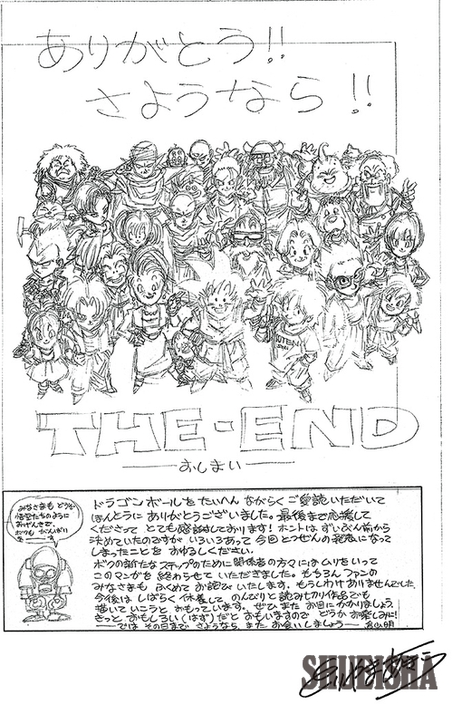Dieser Entwurf zeigt eine große Versammlung von Charakteren, die vor Geschichte und Erinnerungen nur so strotzt, um das Ende von Dragon Balls zehneinhalbjähriger Laufzeit zu markieren! Es ist eine Illustration, die viele Emotionen weckt; gezeichnet genau so, wie Akira Toriyama es sich vorgestellt hatte.