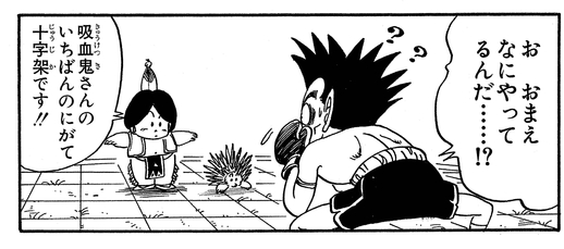 Upa kämpft dann zusammen mit Pual im Uranai Baba's Palace gegen Draculaman . Ihr Gegner mag ein mächtiger Vampir gewesen sein, aber sie schaffen es, mit stinkenden Knoblauchatem und durch Posieren wie Kreuze einen unglaublichen Sieg zu erringen!