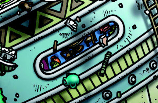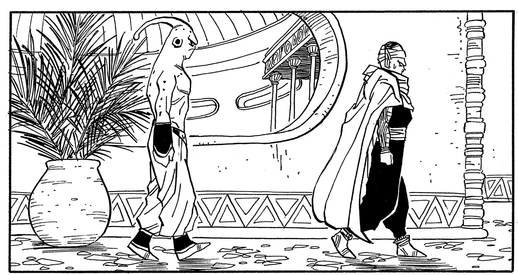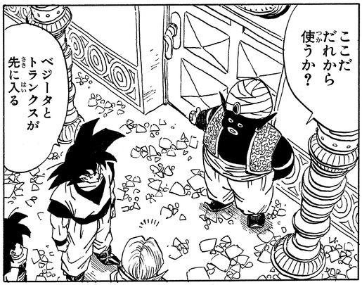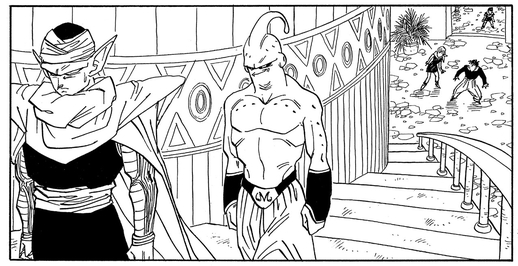 Die klassische Szene, in der Piccolo Majin Buu langsam durch den Palast eskortiert, in der Hoffnung, etwas mehr Zeit für die Ausbildung von Goten & Trunks zu gewinnen, gibt uns viele wertvolle Illustrationen, mit denen wir arbeiten können! Piccolo scheint die labyrinthartige Anordnung des Palastes wie seine Westentasche zu kennen, während er Majin Buu einen gewundenen Gang nach dem anderen hinunterführt.