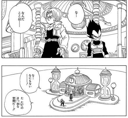 Nun, würdest du dir das ansehen! Sie können Stühle und Tische durch das Fenster sehen! Es ist ein seltsam normal aussehender Raum im Vergleich zum Rest des Palastes. Es gibt jedoch ein paar Töpfe, die unerklärlicherweise neben dem Tisch platziert sind, was dem Raum ein anderes Weltgefühl verleiht. Von allen Räumen, die es in Kami's Palace, ist der einzige, der vollständig illustriert ist, der Raum des Geistes und der Zeit – was eine Schande ist, denn wir wollen unbedingt wissen, wie Dende und die anderen ihre eigenen Wohnräume eingerichtet haben!