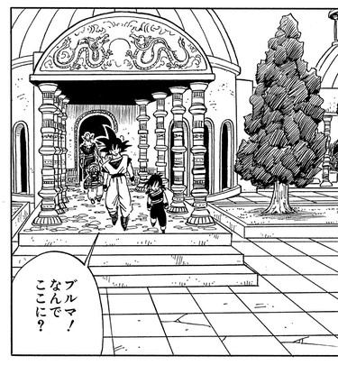 Durch den Eingang gelangt man zu einer Wendeltreppe. Der Bereich zwischen dem Eingang und der Treppe war auch der Ort, an dem Goku mit dem Training von Goten und Trunks.