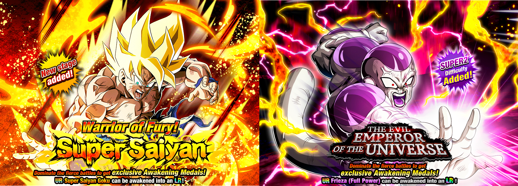 Die Dokkan-Events „Warrior of Fury! Super Saiyan“ und „The Evil Emperor of the Universe“ werden um neue Stages erweitert! Gegner, die in beiden Ergänzungen erscheinen, haben Fähigkeiten zur Schadensreduzierung, die sie jede Runde aktivieren, und sie sind auch Packfähigkeiten, um alle Statuseffekte zu neutralisieren, die du ihnen zuzufügen versuchst! Trainiere hart und kämpfe mit allem, was du hast, um Awakening-Medaillen in die Finger zu bekommen!!