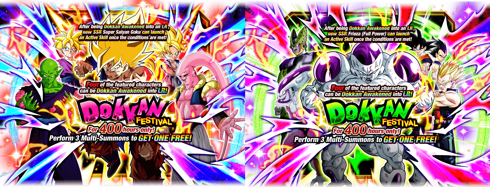 Das Dual Dokkan Festival ist eröffnet! Dieses Mal erscheinen die neuen SSR Super Saiyan Goku und Frieza (Full Power) jeweils in ihren eigenen Hälften der Doppelbeschwörung, und beide können bis hin zu LR Dokkan Erweckt werden!! Sobald sie zu LR erwacht sind, werden beide neuen Charaktere auch eine aktive Fähigkeit mit Stimme freischalten, die aktiviert werden kann, wenn die Bedingungen im Kampf erfüllt sind!
