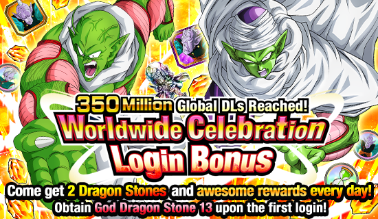 Wenn Sie sich während des Kampagnenzeitraums zum ersten Mal anmelden, erhalten Sie einen kostenlosen Schatzgegenstand „God Dragon Stone 14“, den Sie gegen eine Auswahl von Charakteren Ihrer Wahl eintauschen können, sowie 30 Story Keys aus dem „Worldwide Celebration Login Bonus "! Die "Weltweiten Feier-Missionen", die Drachensteine, Trainingsgegenstände und Hercule-Statuen als Missions-Belohnungen anbieten, und viele weitere Events sind ebenfalls verfügbar!! Porunga mehr Events zu bieten , als Sie sich wünschen können , also kommen Sie zu den explosiven Feierlichkeiten in Dokkan Battle und machen Sie das Beste aus dieser vollgepackten Kampagne!