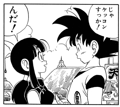 Als Goku ein Junge war, war Chichi , seine Frau zu werden, und sagte ihm: "Ich wette, mein Vater würde dir meine Hand geben", worauf Goku bescheiden antwortete: "Was auch immer er mir geben will ... ich" Ich werde sicher kommen und holen!"
