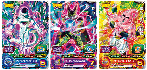 Diese drei Super Dragon Ball Heroes-Karten "Frieza", "Cell" und "Majin Buu : Kid" bilden zusammen ein Frieza Set!