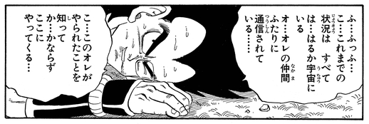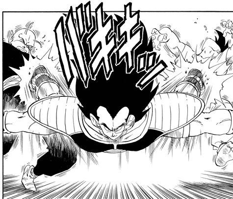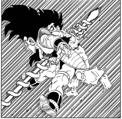 Raditz kann Piccolos Makankosappo: Special Beam Cannon widerstehen, geht aber zu Boden, als Goku seinen Schwanz festhält. Dann tut er so, als hätte er einen Sinneswandel gehabt, um Goku zu täuschen und nutzt die leichte Öffnung, die seine Leistung erzeugt, um einen verheerenden Schlag zu landen.