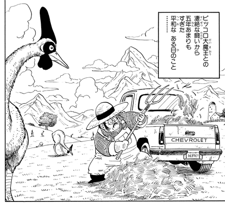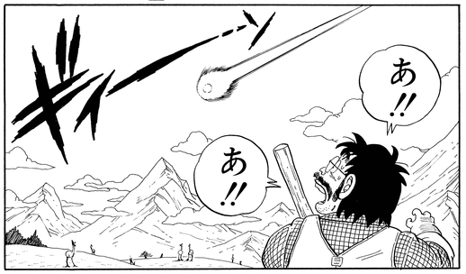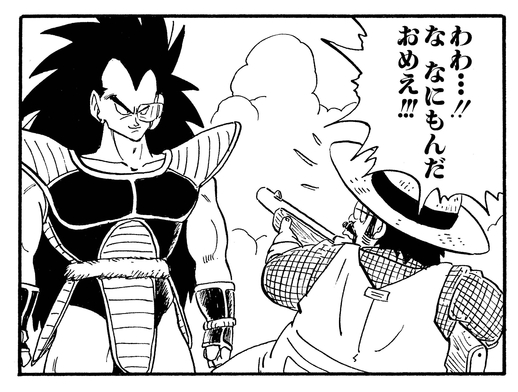 Er denkt, dass es sich um einen Meteoriten oder vielleicht sogar um ein UFO handeln muss. Aber als Raditz' hoch aufragende Gestalt vor ihm auftaucht, gerät er in Panik und schwenkt hektisch seine Waffe, um den mysteriösen Eindringling einzuschüchtern.