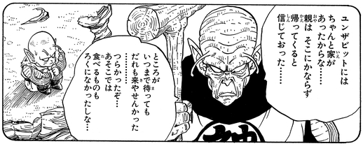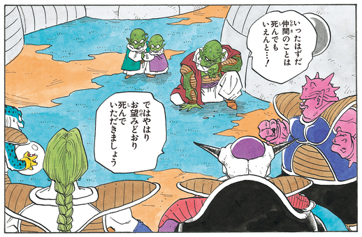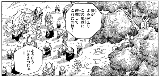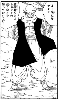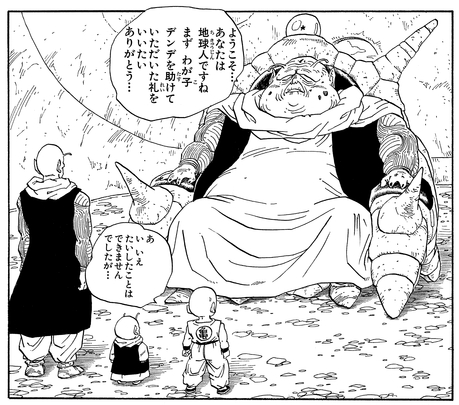 Neben Elder Muri kauern sich Dende– der später der Wächter der Erde werden sollte – und ein fast identischer Namekian Jugendlicher namens Cargo. Sie mögen auf den ersten Blick schwer zu unterscheiden sein, aber Cargo ist etwas kleiner und seine Kleidung hatte eine andere Farbe als die von Dende in der farbigen Ausgabe des Mangas.