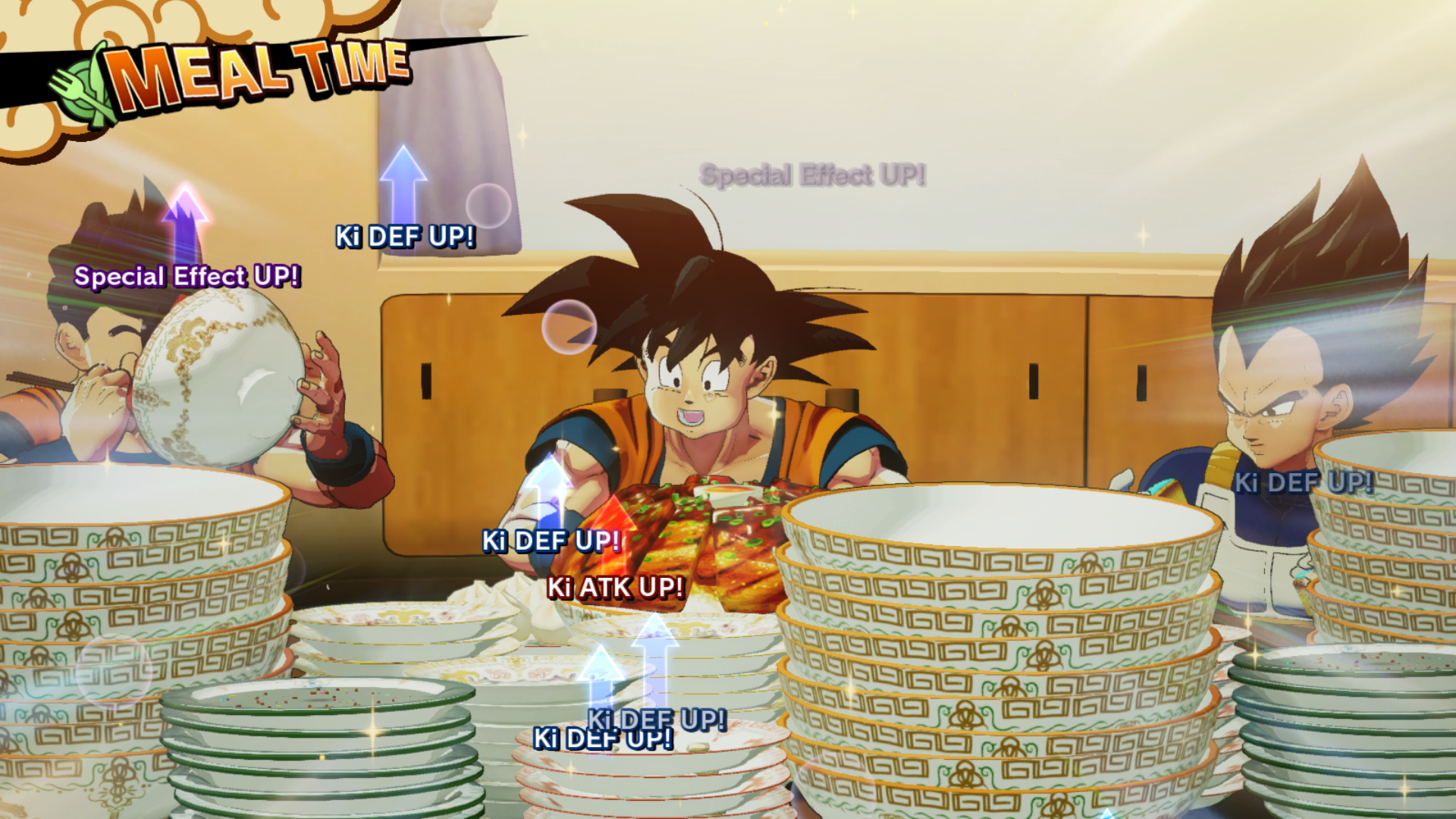 Auch das Essen spielt in „Dragon Ball Z: Kakarot“ eine entscheidende Rolle! Versuchen Sie sich – oder sollten wir Schwanz sagen?! – beim Fischen mit Ihrem Schwanz, jagen Sie sich einen saftig aussehenden Dinosaurier und erleben Sie Gokus wilden Lebensstil aus dem Manga selbst. Das Essen, das du isst, wird deine Statistiken im Spiel verbessern, daher ist eine ausgewogene Ernährung unerlässlich für den Erfolg und ein wichtiger Bestandteil des Trainings!