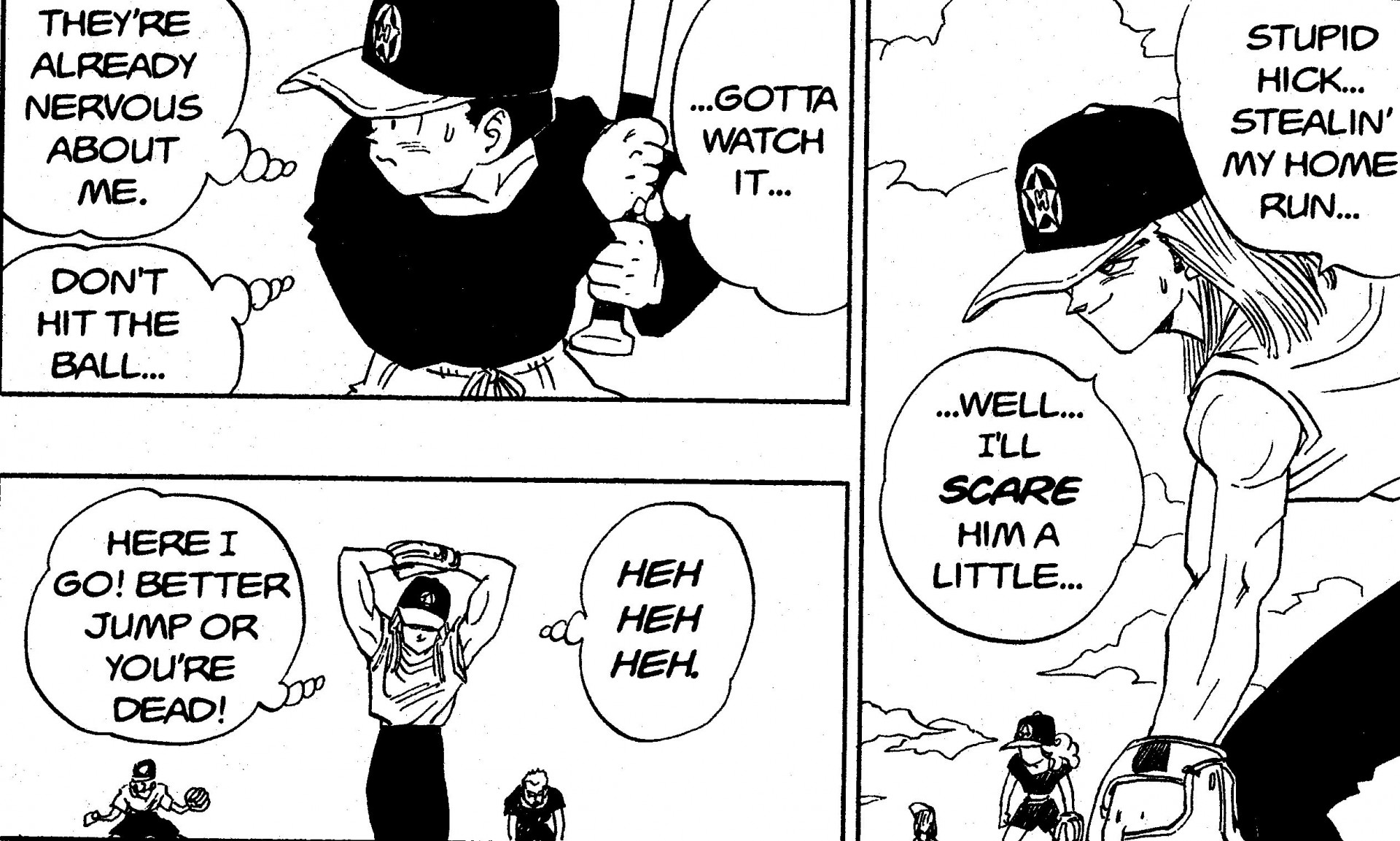 Kurz nach dem Schulbeginn fand sich Gohan zum ersten Mal im Sportunterricht auf dem Baseballfeld wieder. Er verblüffte seine Klassenkameraden, als er mühelos einen Ball fing, der einem sensationellen Homerun ähnelte , der von seinem Klassenkameraden Shapner.